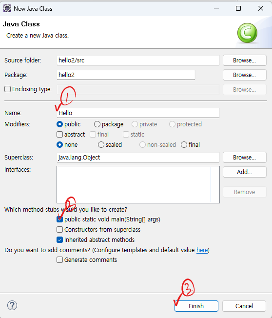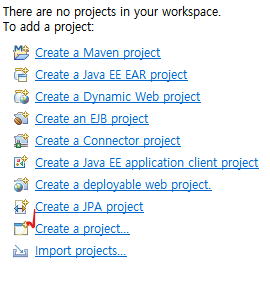 create a project 클릭 -> Java Project -> 이름 입력 및 Finish -> src 내부 데이터 삭제 -> src 우클릭 후 new -> Class 선택 -> Name입력 (첫 글자는 대문자로) public static void Main(String[] args) 자동 생성을 클릭 -> Finish