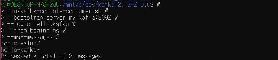 hello.kafka 토픽 중 특정 개수의 데이터 만큼만 보고 싶을 경우 max-messages 옵션을 사용한다.