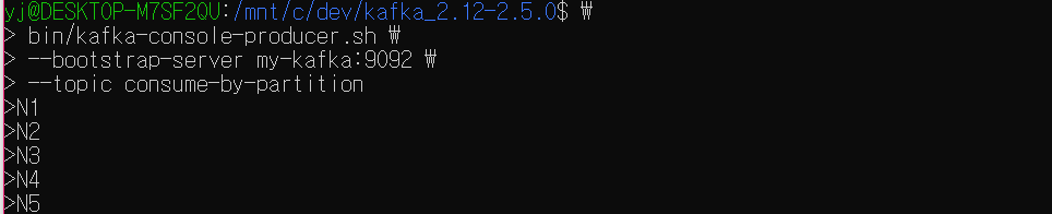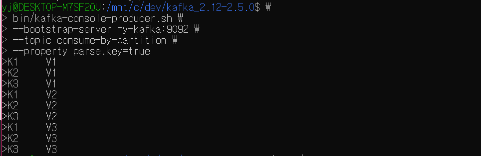 value만을 가지는 메시지를 프로듀싱한 경우에는 라운드로빈 방식으로 파티션에 저장된다는 것을 확인할 수 있다.