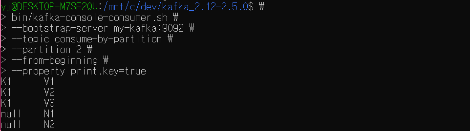 1번 파티션에는 K2, K3 key 레코드들과 key가 null인 레코드들이 저장되어 있다.