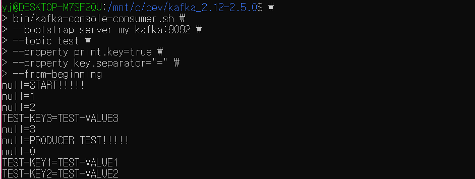 producer를 통해 key-value 형태로 생성한 데이터의 경우 해당 key와 value가 저장한대로 출력되는 것을 확인할 수 있다. 더불어, key를 따로 설정하지 않은 레코드는 key가 null로 출력되는 것을 확인할 수 있다.
