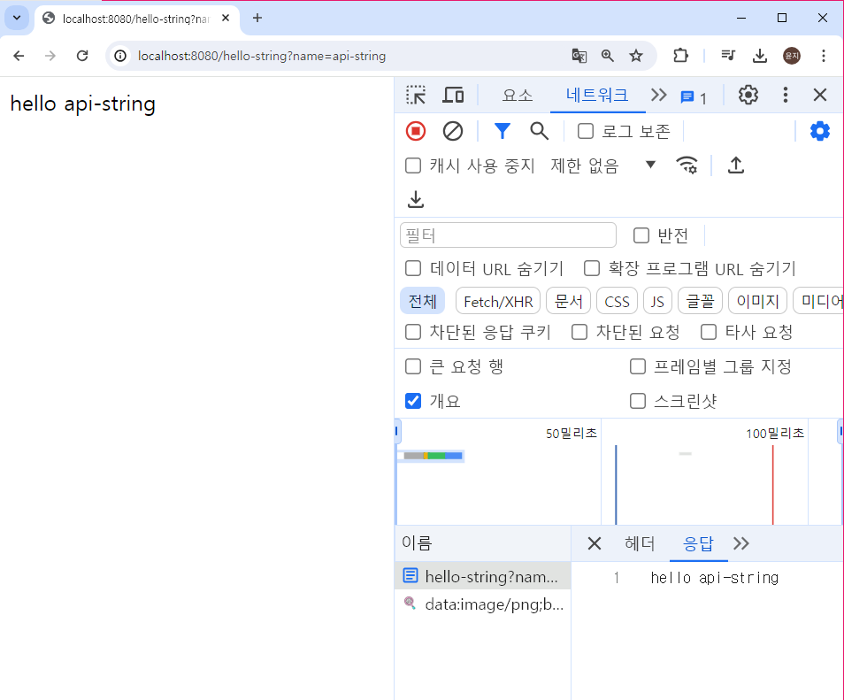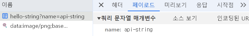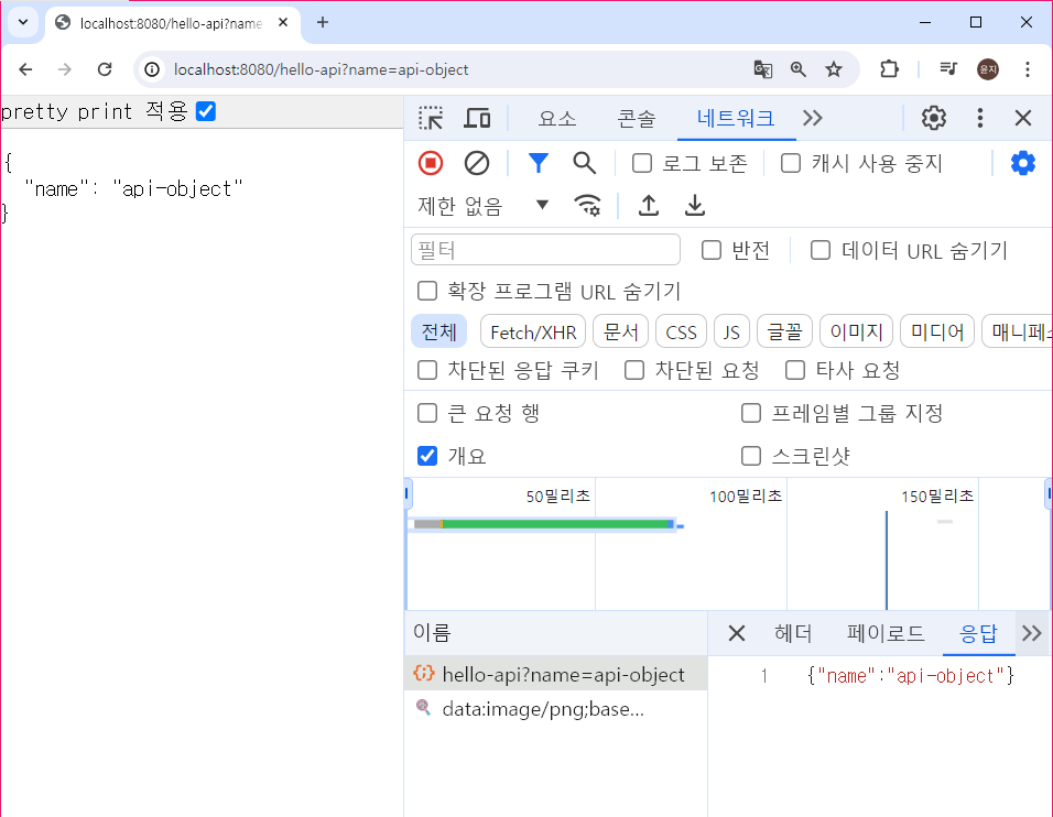 개발자도구를 통해 네트워크의 응답 부분을 살펴보면, 리턴값으로 보내준 데이터를 그대로 응답으로 받아온 것을 확인할 수 있다.
