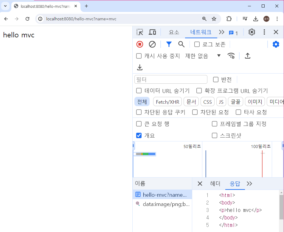 리턴값의 viewName에 해당하는 파일의 html 코드에 attribute로 넣어준 데이터가 합쳐져 완성된 html 코드 자체를 응답으로 받는 것을 확인할 수 있다.