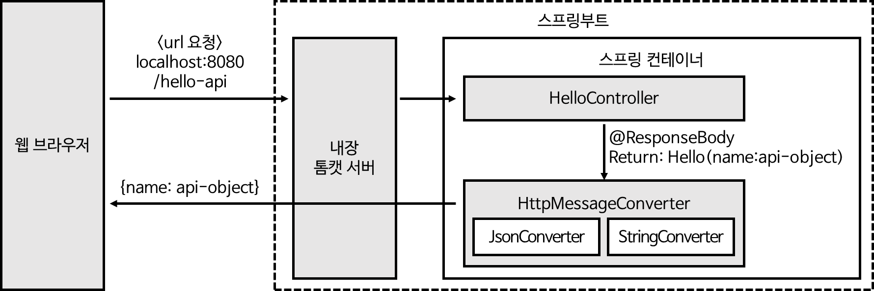 API 방식에서는 @ResponseBody 어노테이션을 사용하여 리턴값을 이용한 뷰 리졸버의 View 조회를 무시한다. 대신 리턴값을 이용해 http 메시지의 body부에 직접 넣어준다.