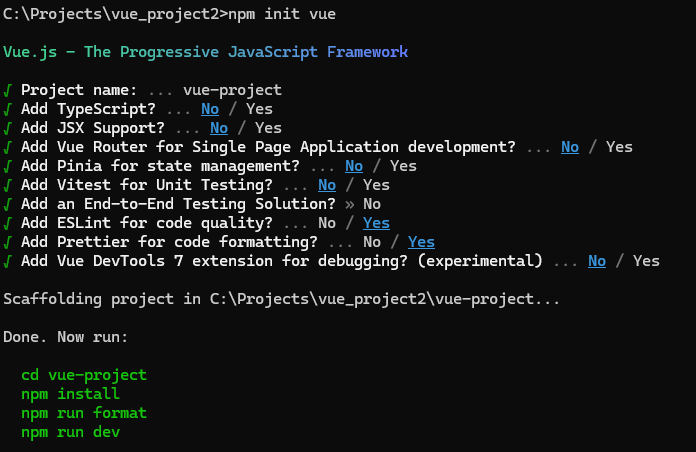 npm init vue로 생성한다.