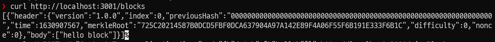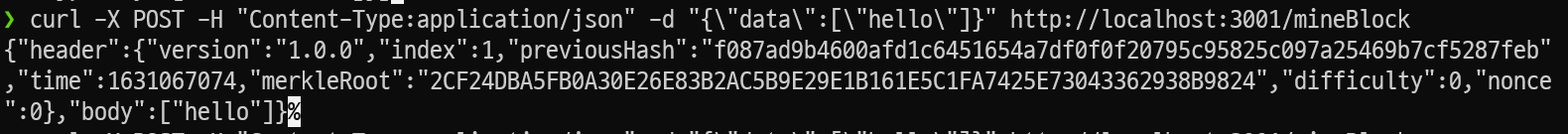 그리고 $ curl -X POST -H "Content-Type:application/json" -d "{\"data\":[\"데이터내용들\"]}" http://localhost:3001/mineBlock