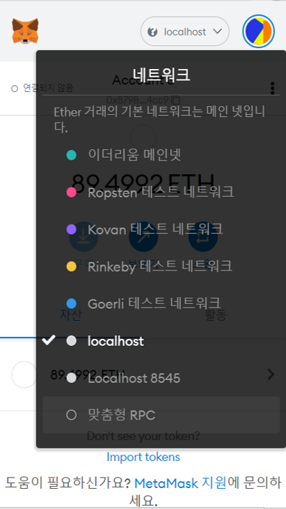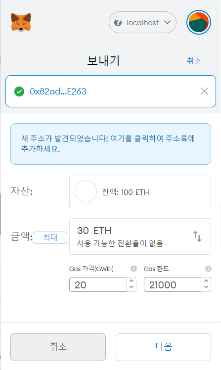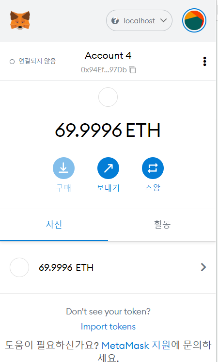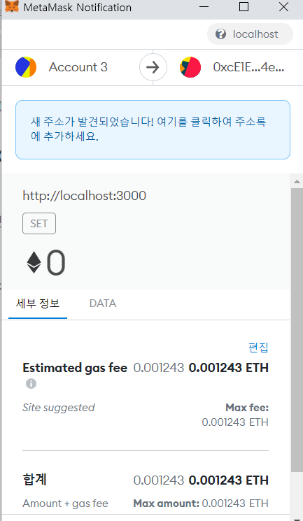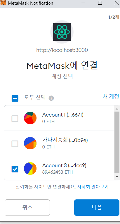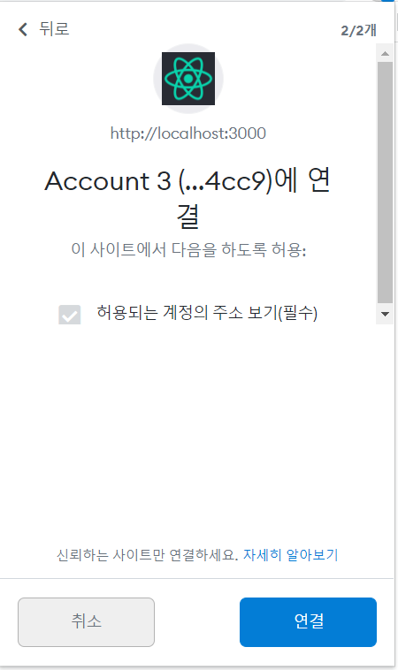 를 입력하자. 그리고 크롬에 들어가서 localhost:3000을 주소창에 검색하면 다음과 같이 메타마스크가 작동을 한다.