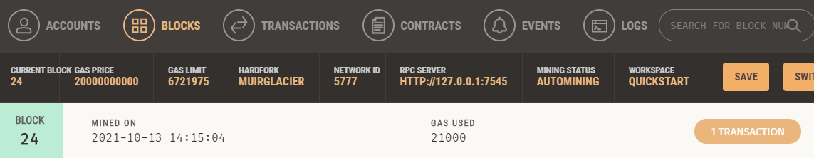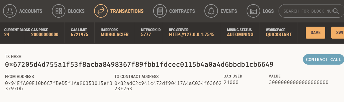 다음과 같이 원래 계정엔 70ETH로 바뀌고, 보냈던 주소는 30ETH를 받아서 130ETH가 되었다. 그리고 원래 계정에는 스마트 컨트랙트 계정에는 TX COUNT, 즉 거래가 몇번 일어났는지에 대한 정보가 담긴다. 올라간 것을 확인할 수 있다.