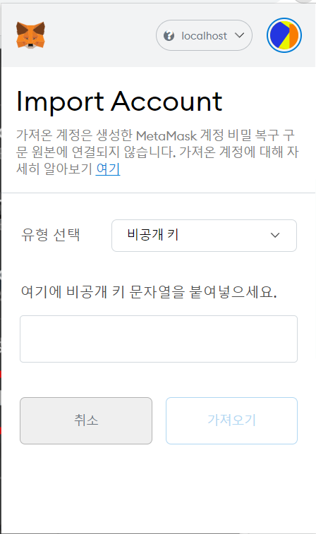 그러면 이렇게 비공개키 문자열을 붙여넣으라고 나온다.