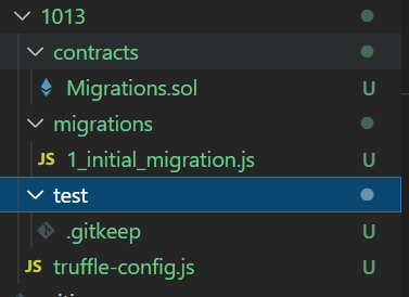 라는 폴더가 생기고, 그 안에 constracts라는 폴더가 생긴다. 그리고 그 안에 json파일이 두개 생김을 알 수 있다. 이는 저번 시간에 컴파일할 때 생기는 abi와 bin의 내용을 담고있는 파일들이다.그리고 migrations폴더에 새로운 파일을 하나 생성한다.