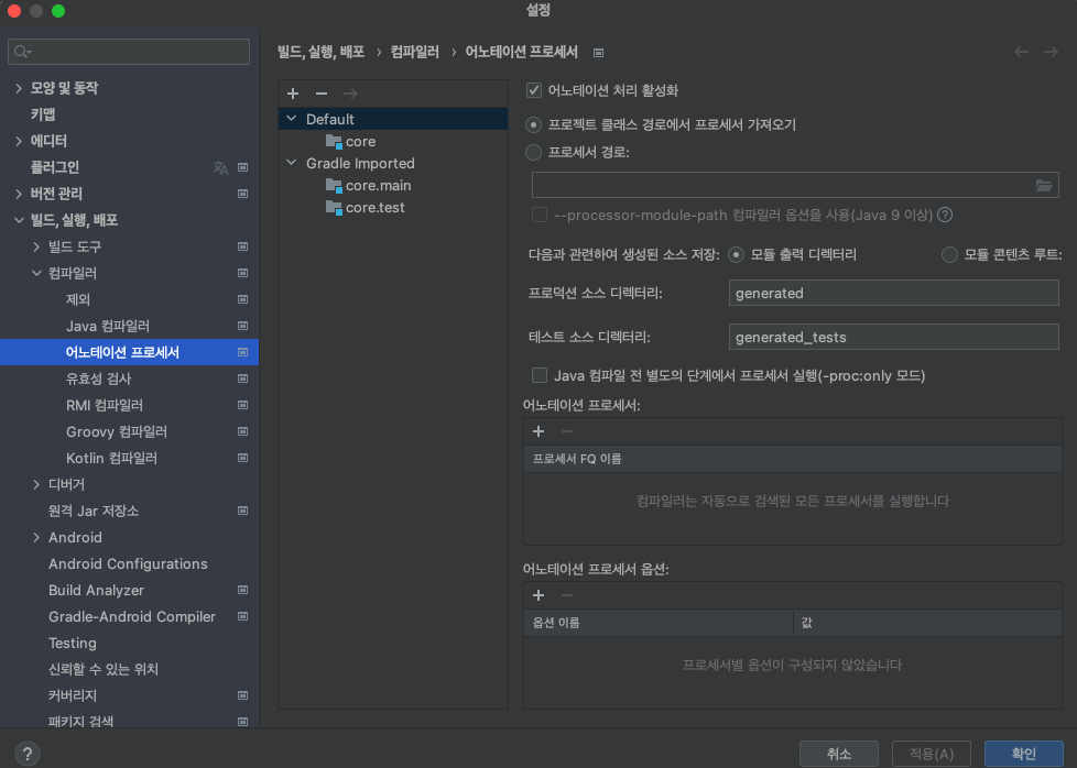 설정 -> 컴파일러 -> 어노테이션 프로세서 ->