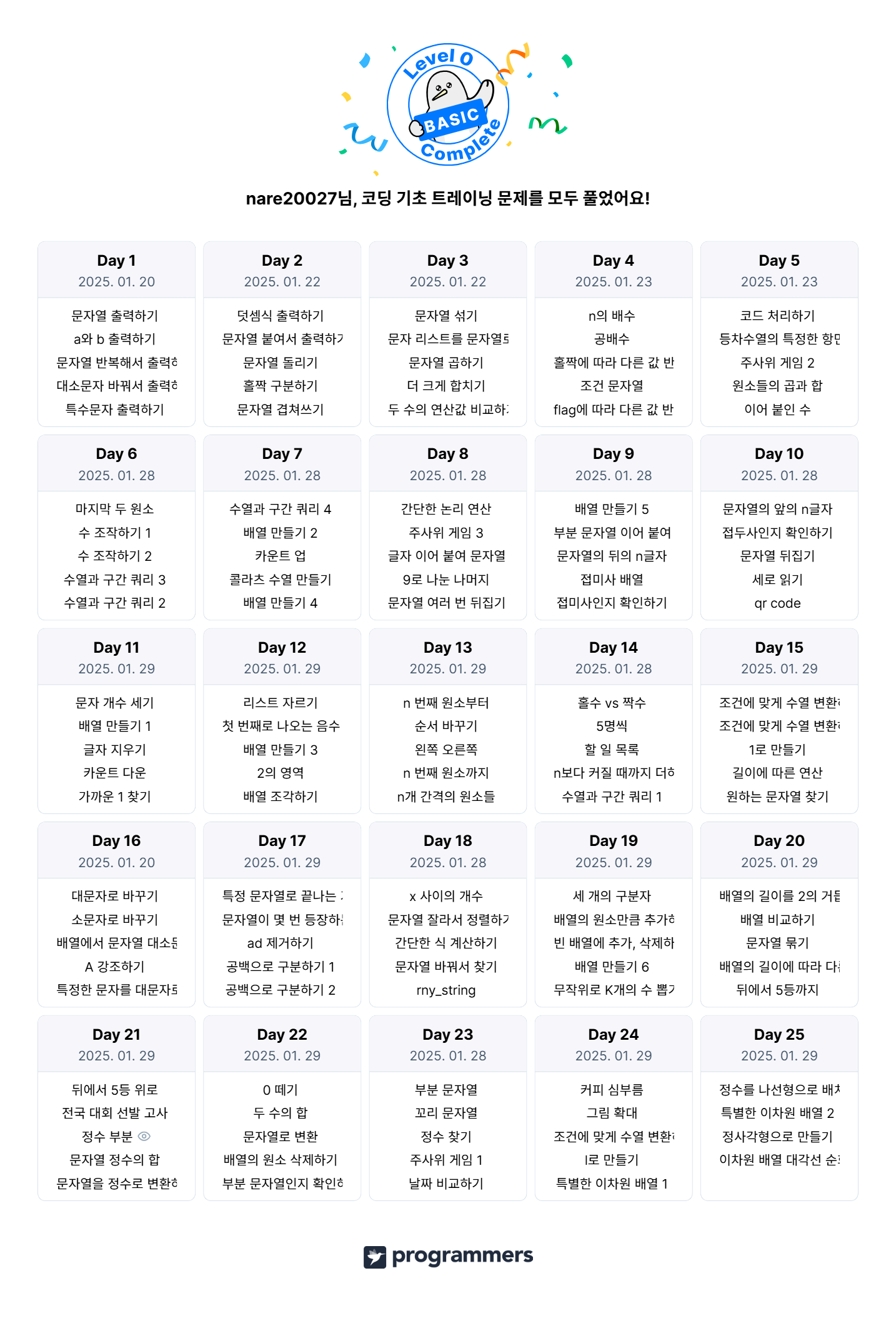 Lv1.문제들도 꾸준히 풀어서 코딩 테스트 감을 잃지 않도록 해야겠다.