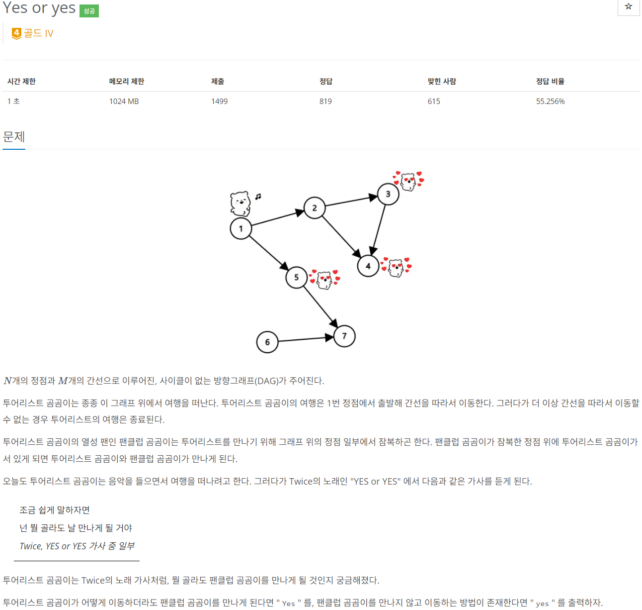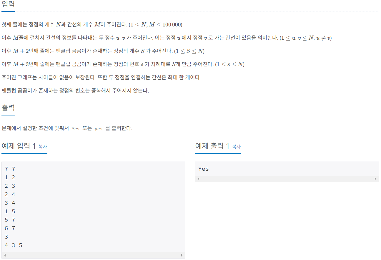 경로를 탐색하면서 팬을 만나거나, 정점에 도달할 수 없다면 Yes, 팬을 만나지 않고 도달할 수 있다면 yes를 출력한다.