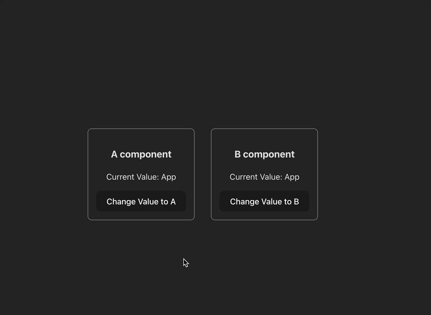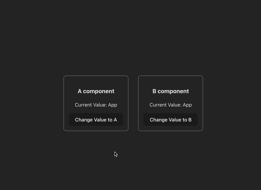 아래와 같이 두 개의 컴포넌트(A, B)에서 같은 키에 대해 구독을 하고 값을 변경했을 때 동기화가 되는 것을 확인했어요.
