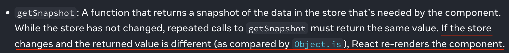 그렇기 때문에 공식 문서에서 말한 "store가 변경되진 않았지만 getSnapshot을 호출 할 때 마다 다른 값을 반환해요.
