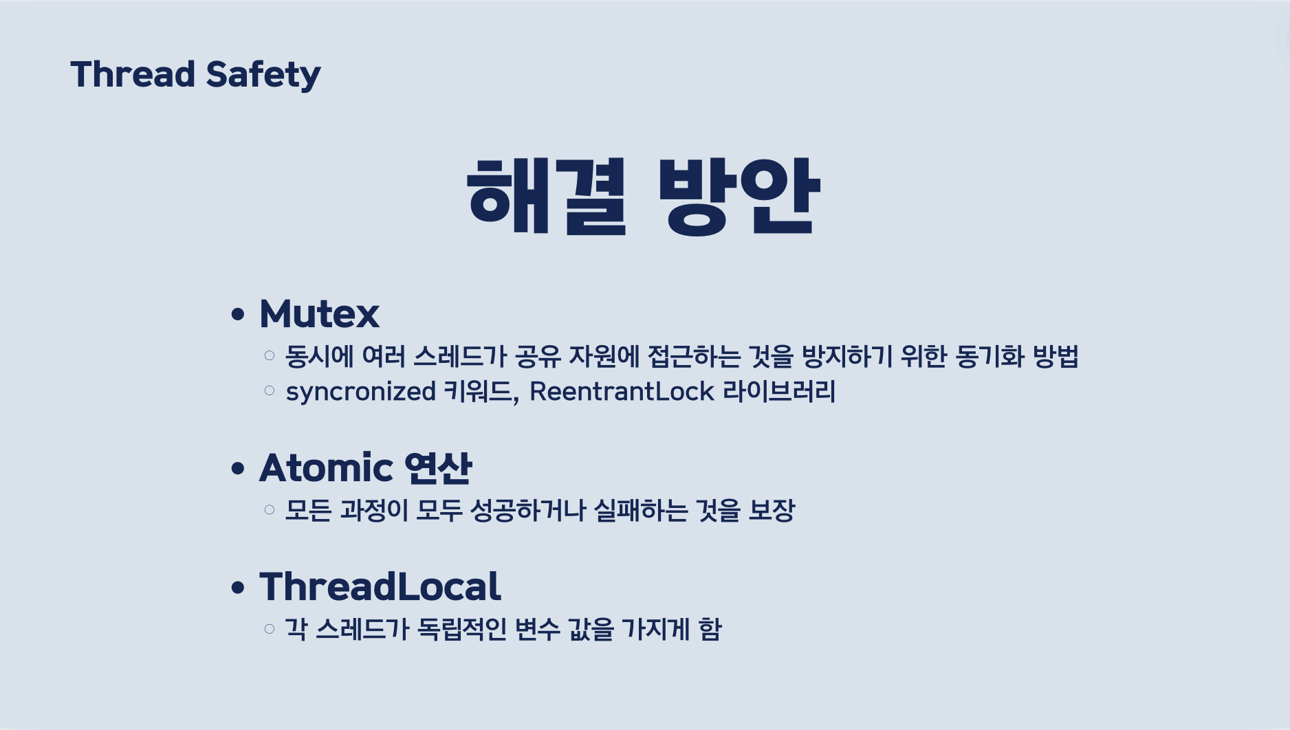 ์ ๊ธ์์ ์์๋ณธ Thread Safe๋ฅผ ์งํค๊ธฐ ์ํด์ ์๋์ ๊ฐ์ ํด๊ฒฐ๋ฐฉ์์ด ์๋ค.