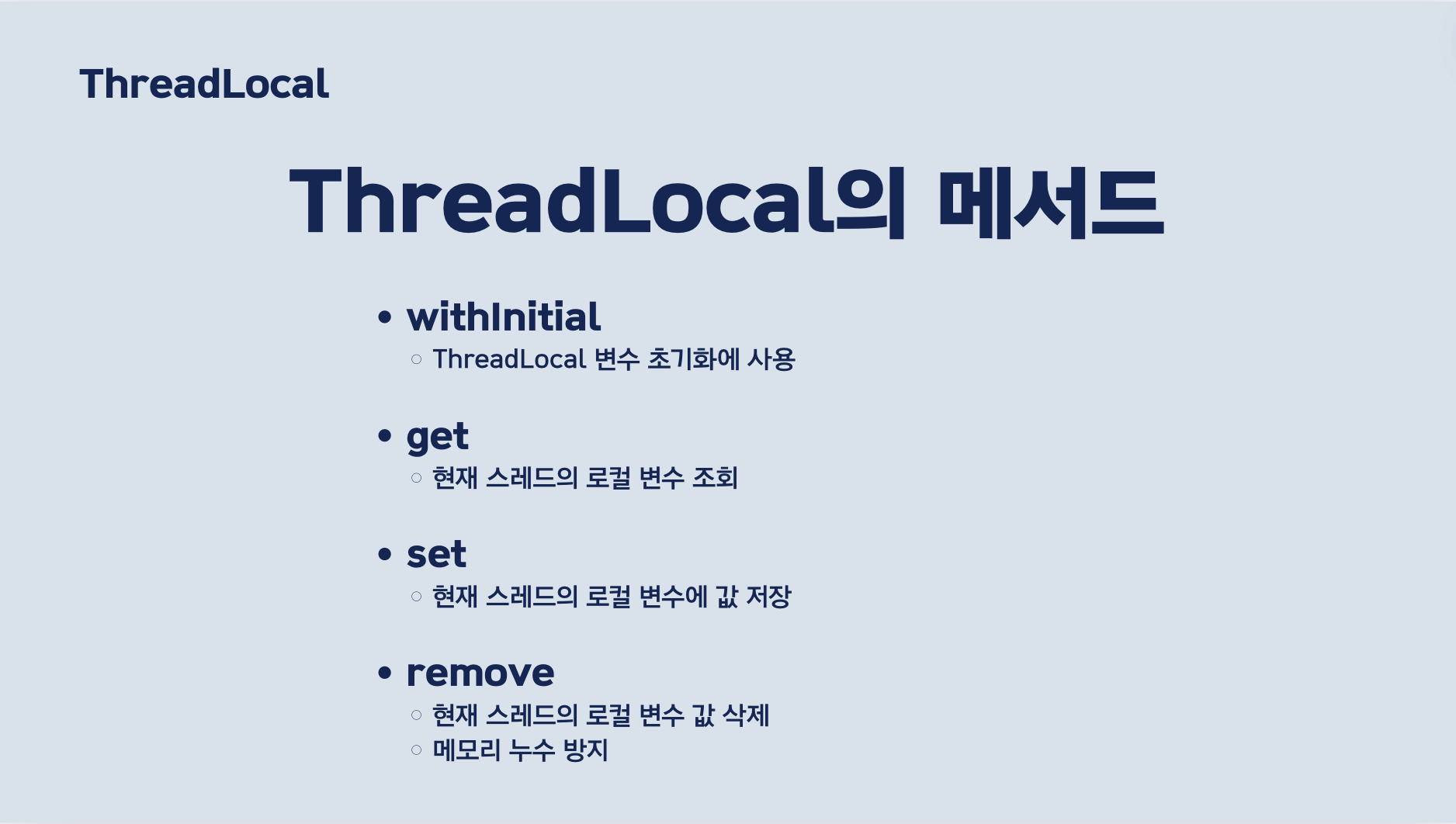 ThreadLocal์ ํด๋น ์์์ ์ ๊ทผํ์ฌ CRUD ํ ์ ์๋ ๋ฉ์๋๋ฅผ ๊ฐ์ง๊ณ ์๋ค.