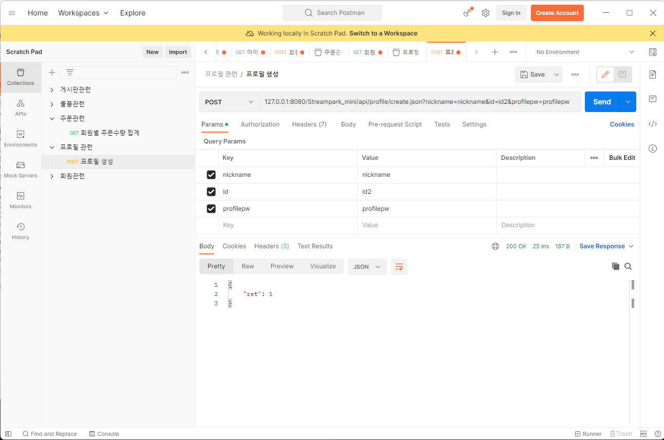 주소창에 127.0.0.1:8080/Streampark_mini/api/profile/create.json 를 입력하고