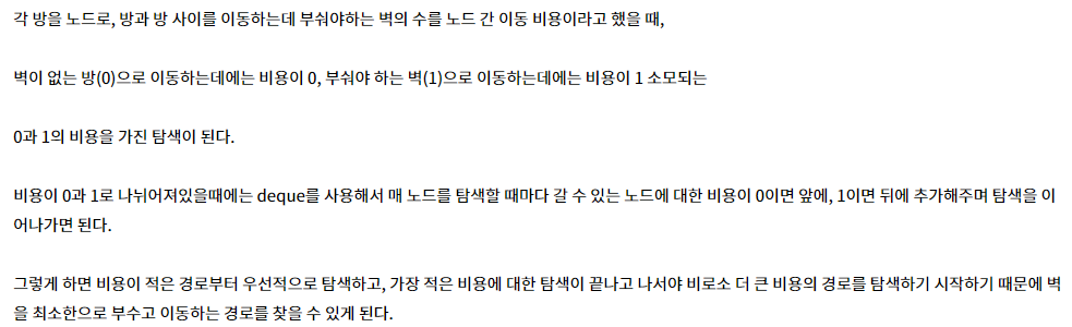나는 1261을 우선순위 큐로 해결하려고 했는데, 굳이 우선순위 큐 없이 deque의 메소드를 잘 이용하는 것 같아서 위의 방법이 더 좋다고 느껴졌다.