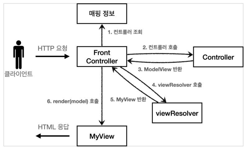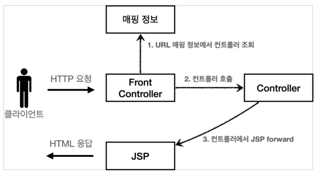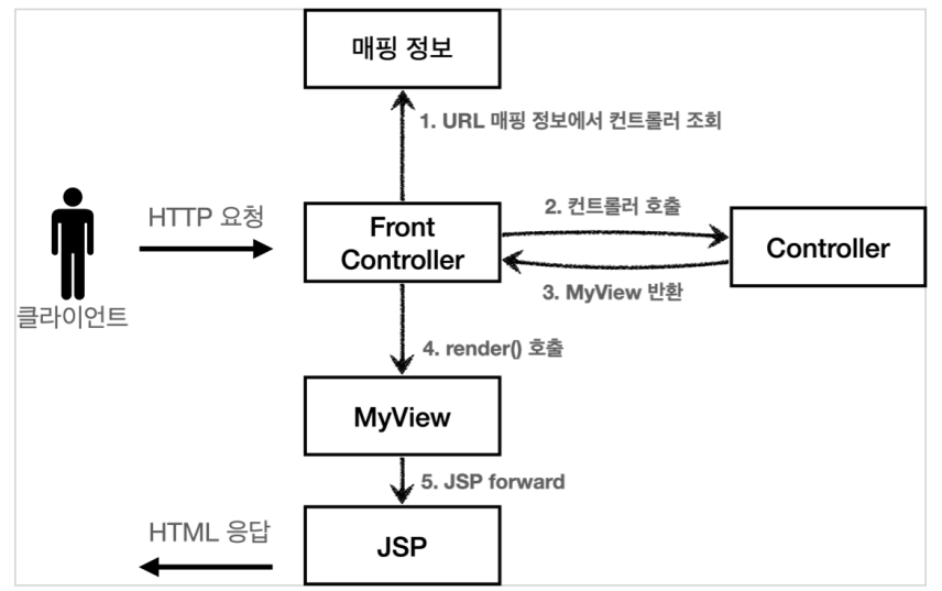 프론트 컨트롤러의 도입으로 MyView 객체의 render() 를 호출하는 부분을 일관되게 처리해 최종적으로 JSP 가 실행된다. 즉, 각각의 컨트롤러는 MyView 객체를 생성만 해서 반환만 해주면 된다 !