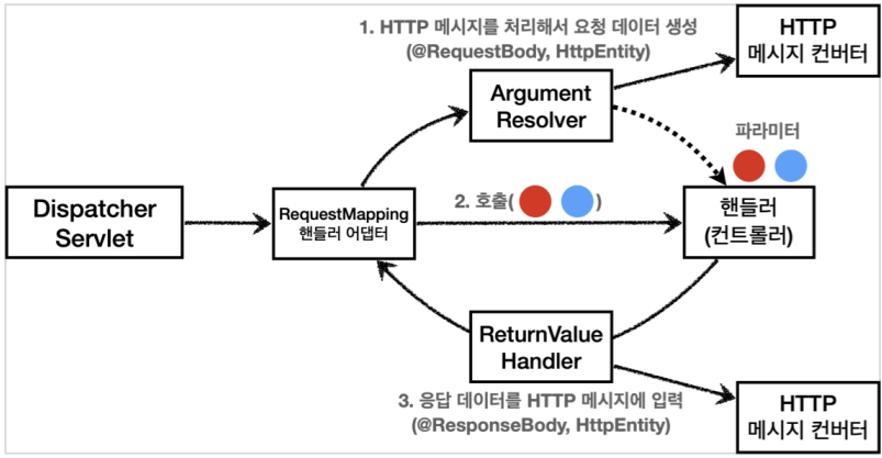 요청 의 경우, @RequestBody 를 처리하는 ArgumentResolver 가 있고, HttpEntity 를 처리하는 ArgumentResolver 가 있다. 이 ArgumentResolver 들이 HTTP 메시지 컨버터를 사용해 필요한 객체를 생성하는 것이다.