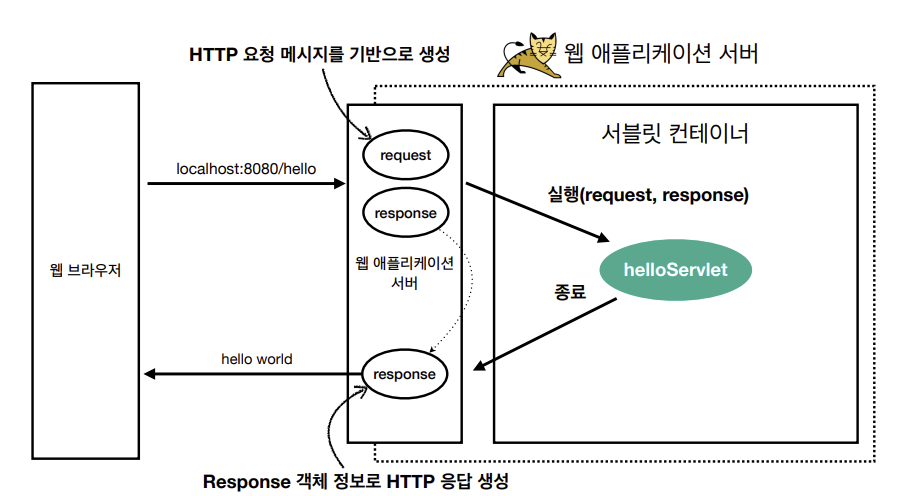 Request, Response 객체를 새로 만들어서 서블릿 객체를 호출한다. Response 객체에 담겨 있는 내용으로 HTTP 응답 정보를 생성한다. 💡 서블릿 컨테이너란 ?
