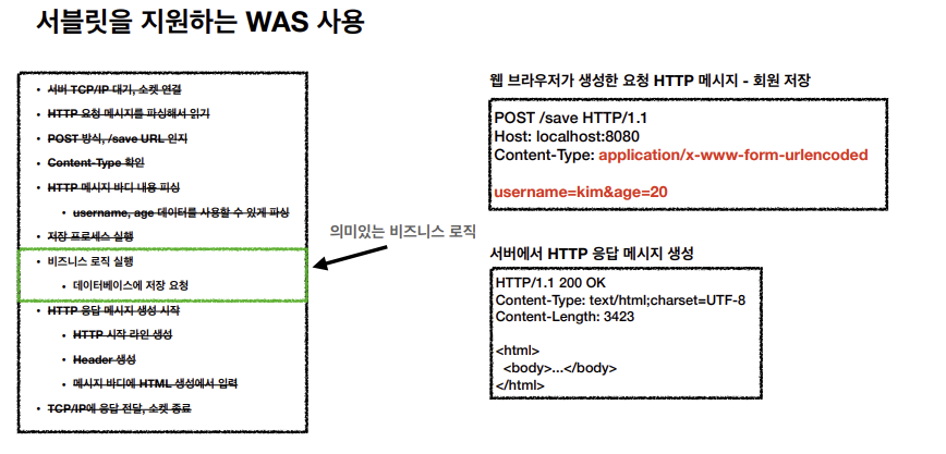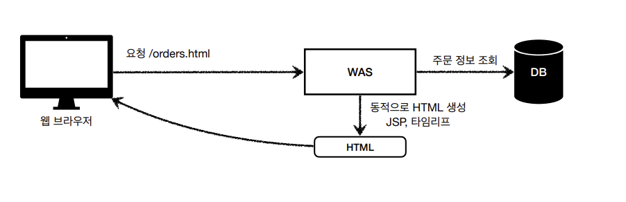 정적 리소스는 웹 서버가 처리하고, 웹 서버는 애플리케이션 로직 같은 동적 처리가 필요하면 요청을 WAS 에 위임한다. 즉, WAS 는 중요한 애플리케이션 로직 처리를 전담하는 것이다.