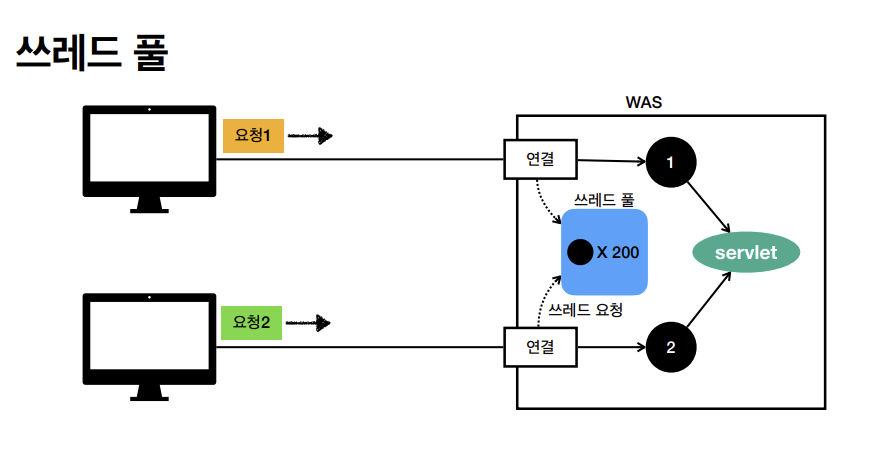 필요한 쓰레드를 쓰레드 풀에 보관하고 관리하는데, 쓰레드 풀에 생성 가능한 쓰레드의 최대치를 관리하게 된다. (톰캣은 최대 200개 기본 설정)