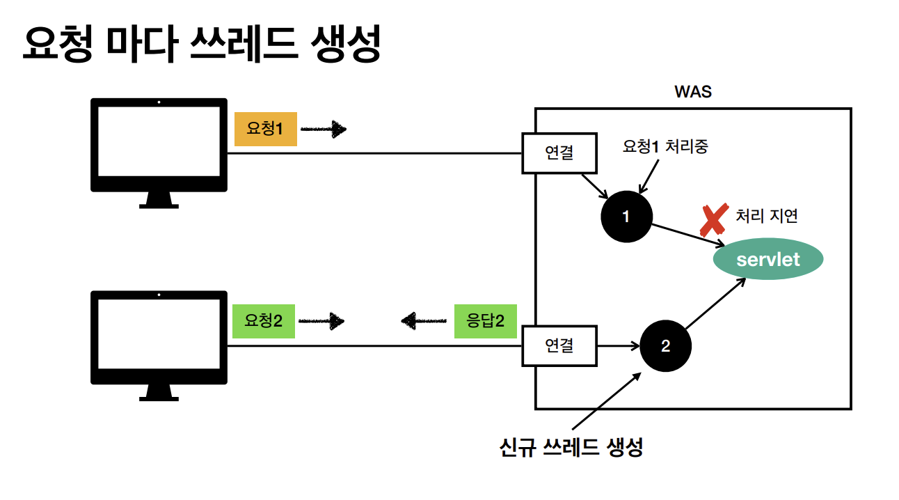 멀티 쓰레드에 대한 부분은 WAS 가 모두 처리해주므로 개발자는 이것을 신경 쓰지 않아도 된다.