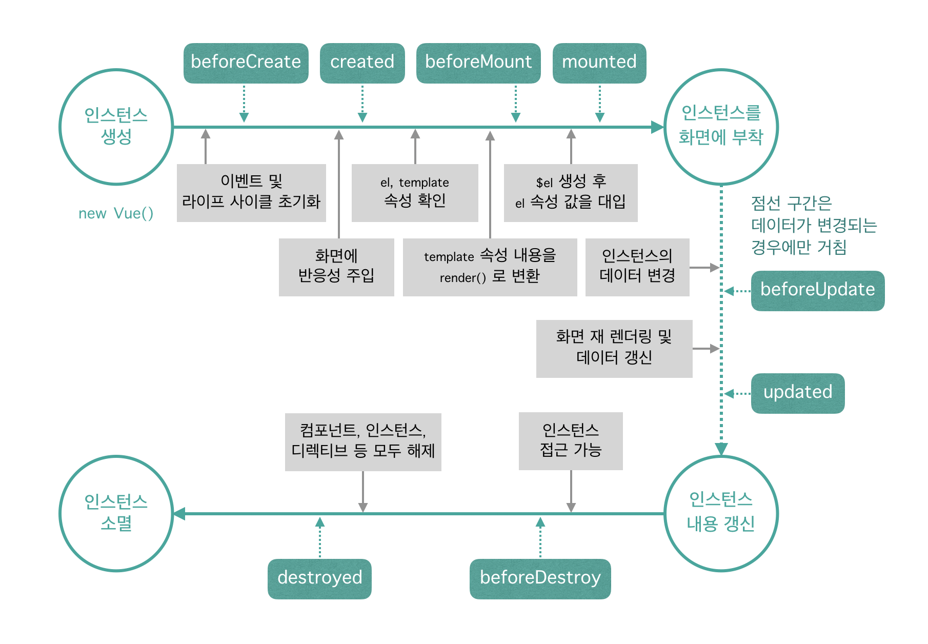 - Vue 인스턴스나 컴포넌트가 생성되고 소멸되기까지의 단계