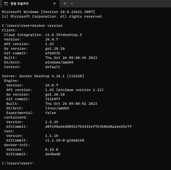 현재 자신의 설치한 docker의 버전과 설명들이 나옵니다.