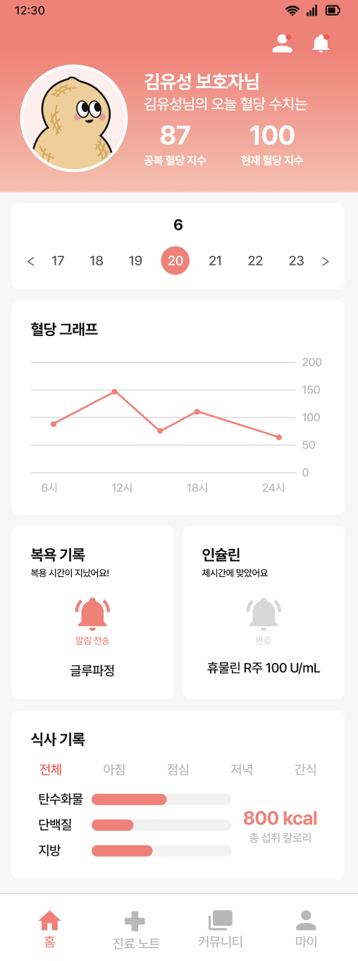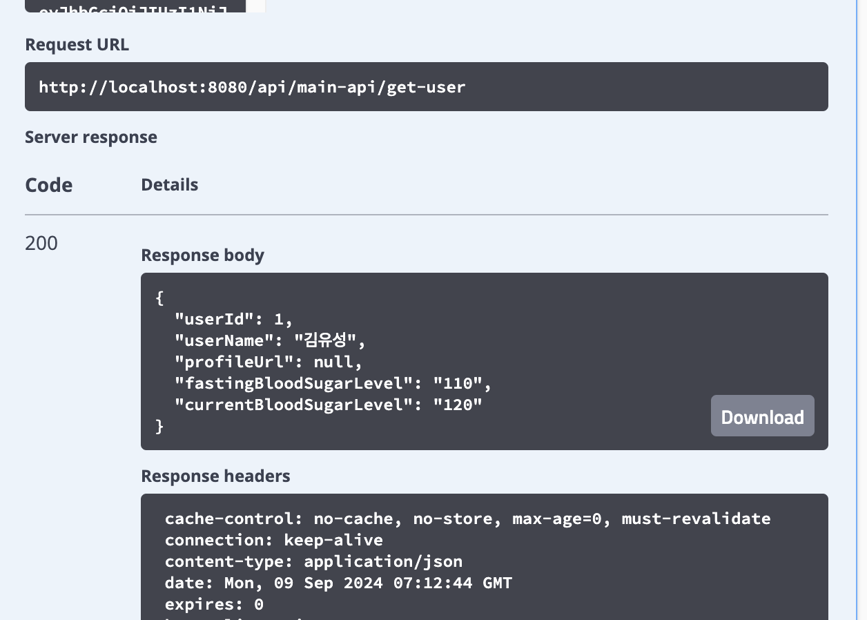 위 디자인을 보면 알 수 있듯이, 데이터는 유저이름,유저 프로필 이미지, 공복혈당, 최근혈당을 반환해야합니다. dto에 userId를 포함한 필요 데이터들을 정의하고 반환했습니다.