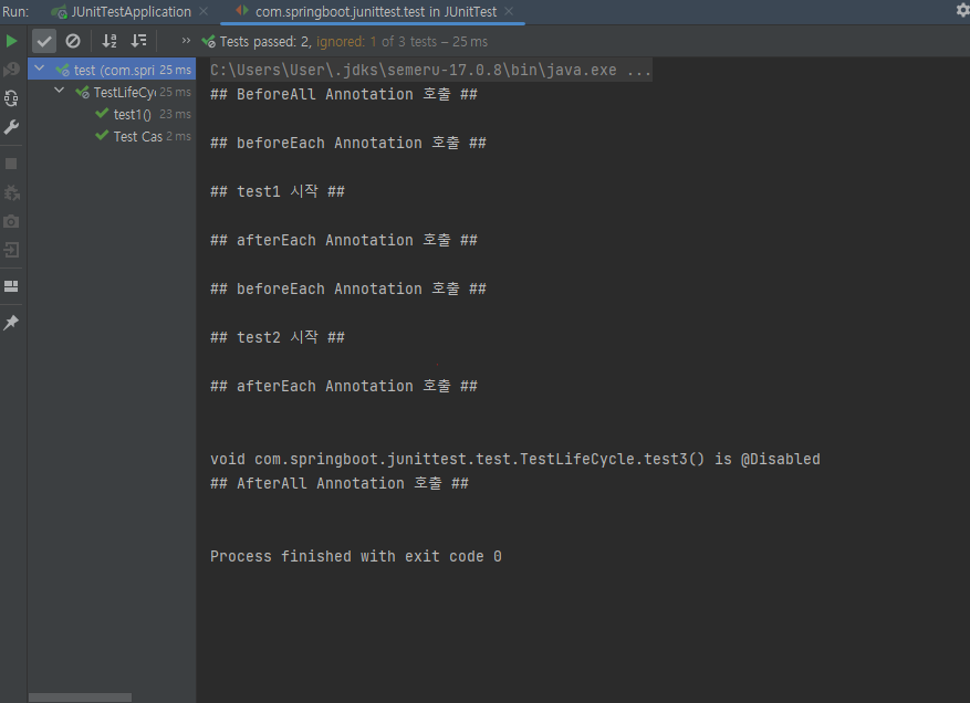 @AfterAll : 테스트를 종요하면서 호출되는 메서드를 정의한다