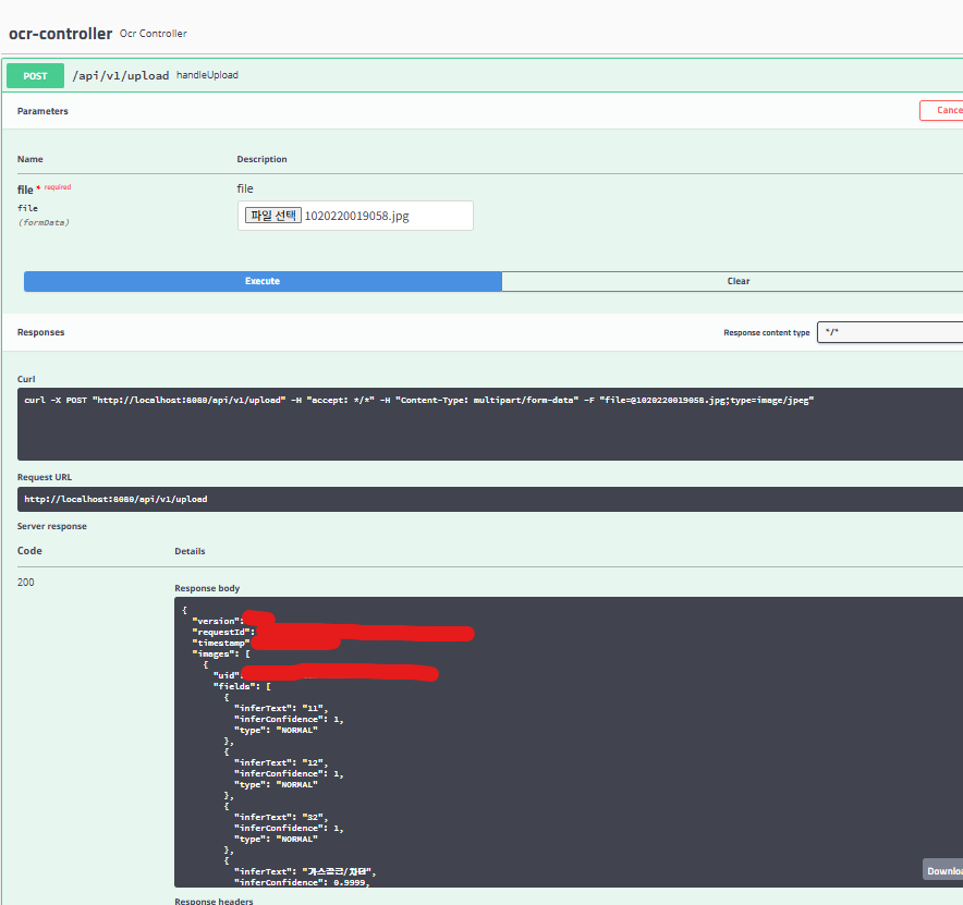 callOcrApi(File) 이미지 파일을 OCR API에 전송하고 전체 응답을 파싱함