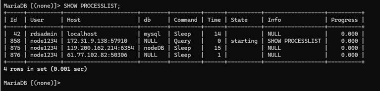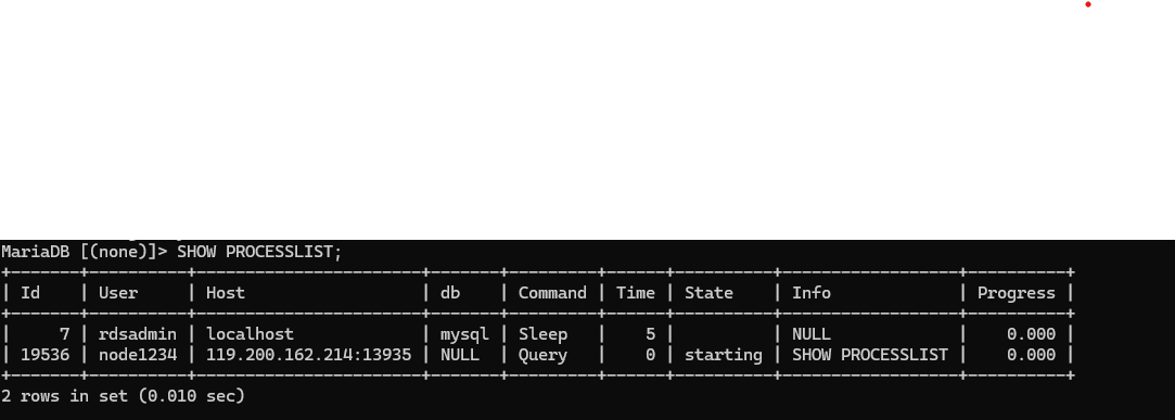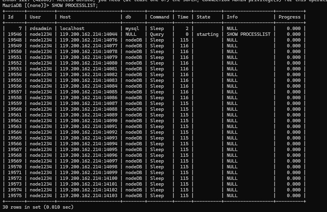 프로젝트를 실행 시킨 뒤 'SHOW PROCESSLIST'로 현재 사용중인 스레드에 대한 정보를 확인했습니다.