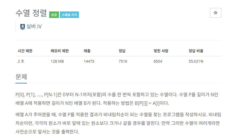 배열 A가 주어졌을 때, 수열 P를 적용한 결과가 비내림차순이 되는 수열을 찾는 프로그램을 작성하시오. 비내림차순이란, 각각의 원소가 바로 앞에 있는 원소보다 크거나 같을 경우를 말한다. 만약 그러한 수열이 여러개라면 사전순으로 앞서는 것을 출력한다.