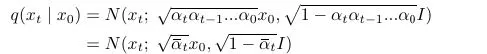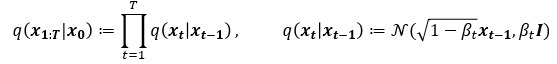 The total noise adding process is a joint distribution of Markov chain gradually adding Gaussian noise. The interesting part of forward process is that the variance Ξ²tβI is a hyperparameter not a trainable parameter. The reason why the mean and the variance of the Gaussian distribution has the particular form is due to βt=1TβN(1βΞ²tββ,Ξ²tβI)=p(xTβ)βN(0,1) when Ξ²tβ is small enough (Meaning that Ξ² is very small).