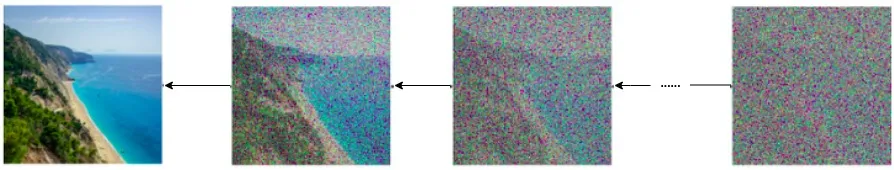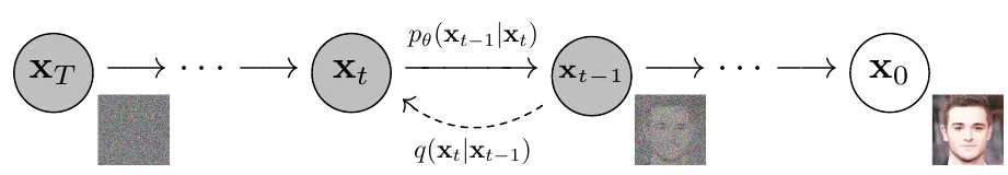 starting from a pure Gaussian noise: p(xTβ)=N(xTβ;0,I). The whole denoising process of pΞΈβ(x0:Tβ) is given as p(xTβ,xTβ1β,...,x0β)=p(xTβ)βp(xTβ1ββ£p(xTβ))βp(xTβ2ββ£p(xTβ)p(xTβ1β))...βp(x0ββ£x1β,x2β,...xTβ)=p(xTβ)βp(xTβ1ββ£p(xTβ))...βp(x0ββ£x1β) by the Markov Assumption. Finally this chain of equations can be simplified to a product form(β).