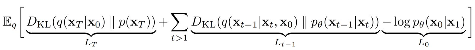L0β β The authors got better results without this. LTβ β This is the βKL divergenceβ between the distribution of the final latent in the forward process and the first latent in the reverse process. However, there are no neural network parameters involved here, so we canβt do anything about it except define a good variance scheduler and use large timesteps such that they both represent an Isotropic Gaussian distribution.