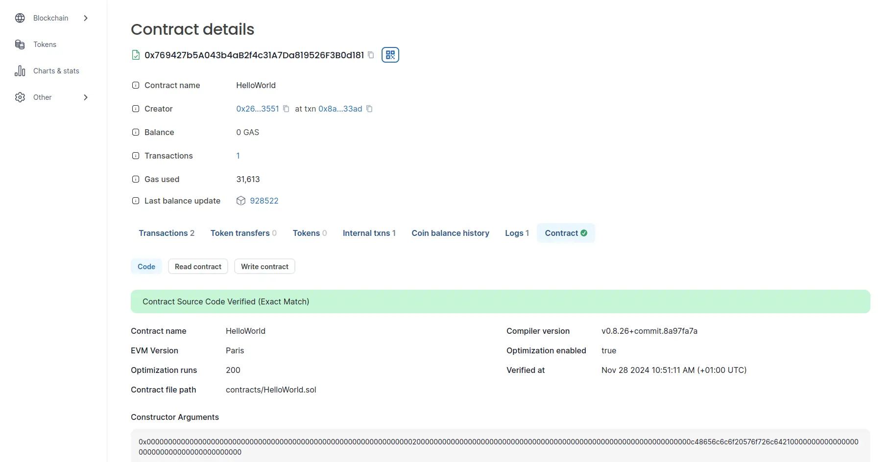 블록 탐색기에서 HelloWorld 컨트랙트 검증 성공.