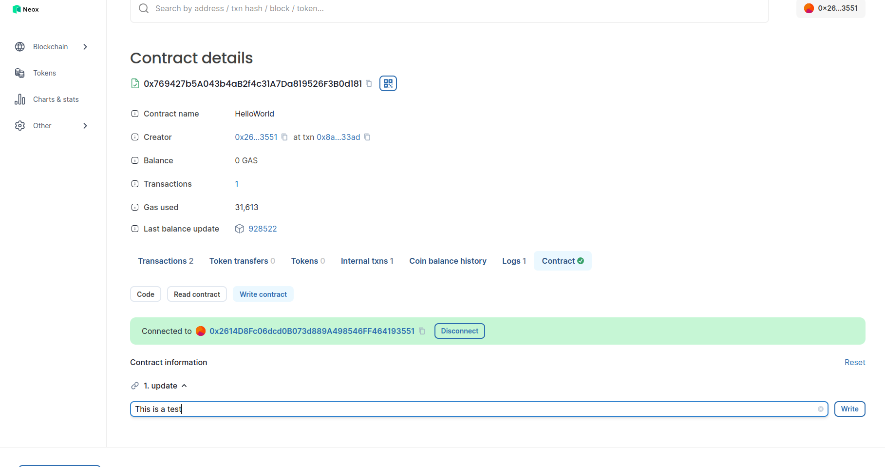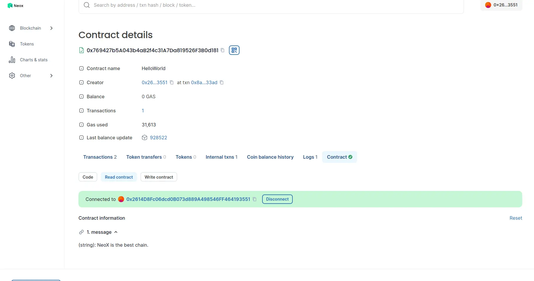 이제 NeoX에 배포한 Hello World 컨트랙트의 컨트랙트 해시를 보관해야 합니다. 이 해시는 다음 단계에서 사용할 것입니다. 이 예제에서는 0x769427b5A043b4aB2f4c31A7Da819526F3B0d181을 사용하겠습니다.