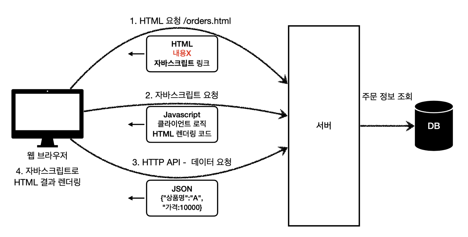 ▪️ 서버에서 일단 비어있는 html 파일을 받아온 다음 JS 코드를 통해서 최종 화면을 그려줌