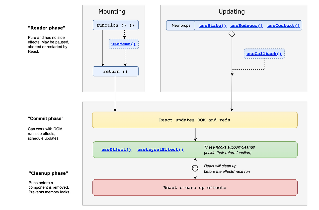 | 언마운트 (Unmount) | componentWillUnmount() | useEffect(() => { return () => {...}; }, []) |