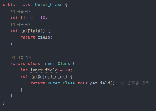 // 이때 Outer_Class 객체는 메소드 호출용으로 일회용으로 사용되고 버려지기 때문에 GC 대상이 되어야 한다.
