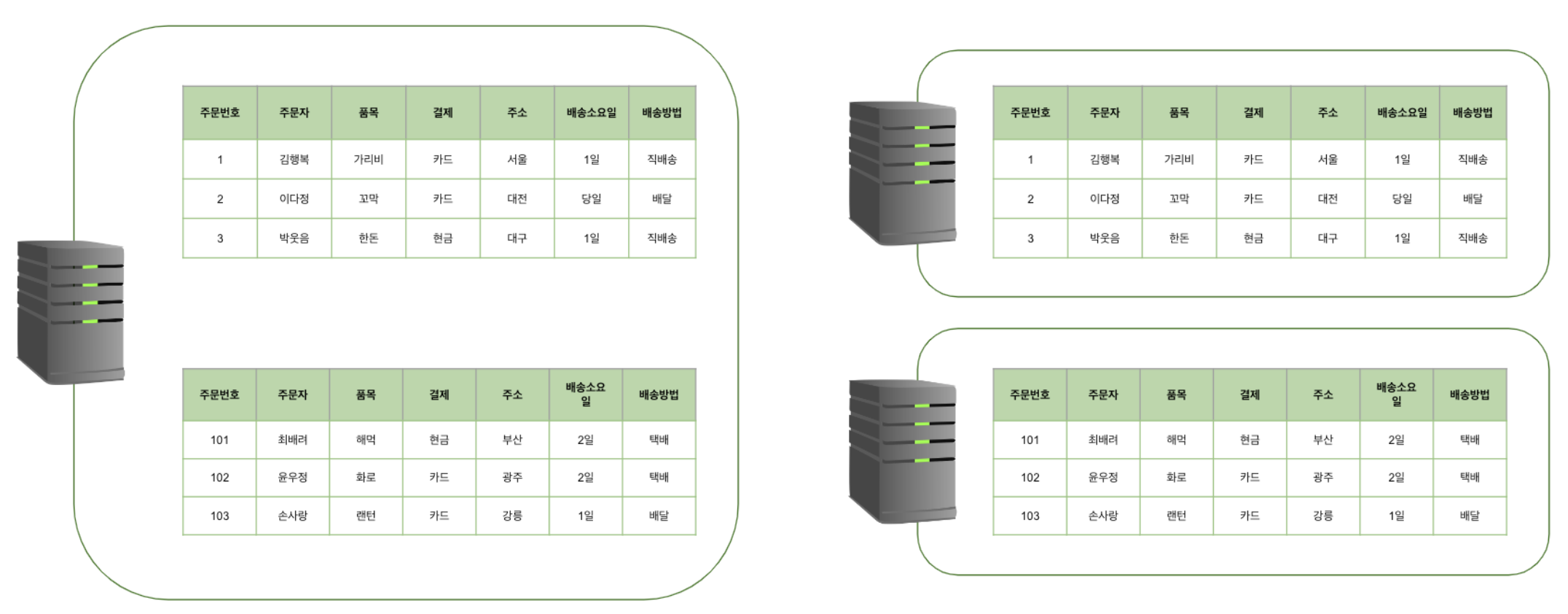 샤딩은 동일한 스키마를 가지고 있는 데이터를 다수의 데이터베이스에 분산하여 저장하는 기법이다.