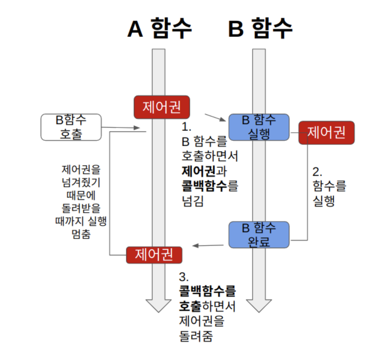 부모함수가 A를 실행시킬 때 제어권을 아예 넘겨주게 되어서, 본인은 다른 일을 하지 못하고 A의 작업이 끝날때까지 마냥 기다리는 것이다. 그러다 A의 작업이 끝나면 제어권을 돌려받고 다음함수인 B를 실행시킨다.