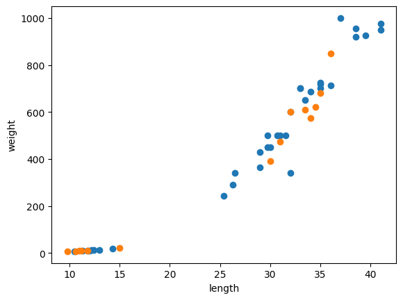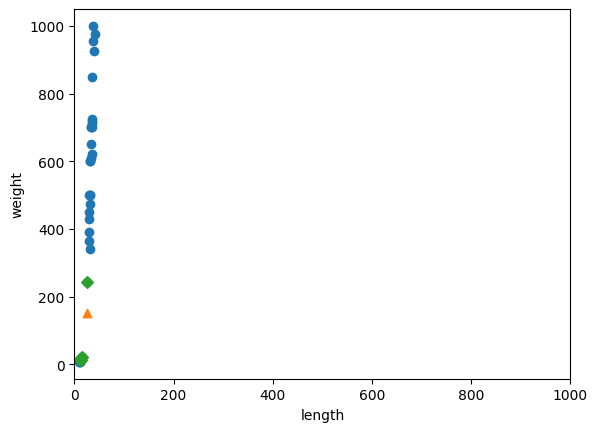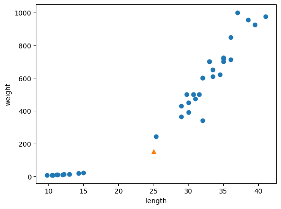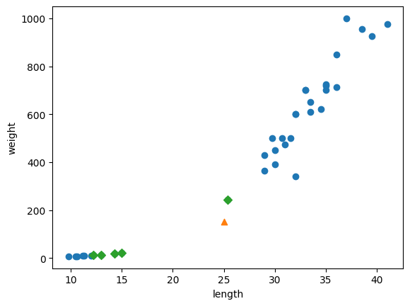 도미 데이터와 비교하기 쉽도록 도미 데이터가 그려져 있는 산점도에 추가를 해보자