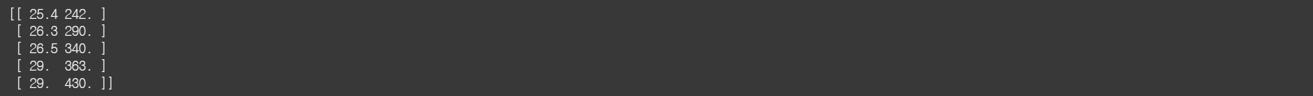 사이킷런에서 입력 데이터는 행이 샘플(데이터) 열은 각 특성을 뜻한다