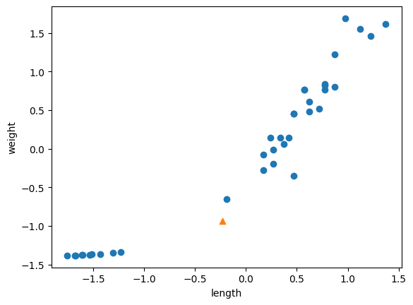 이제 이 데이터셋으로 다시 k-최근접 이웃 모델을 훈련시켜보겠다