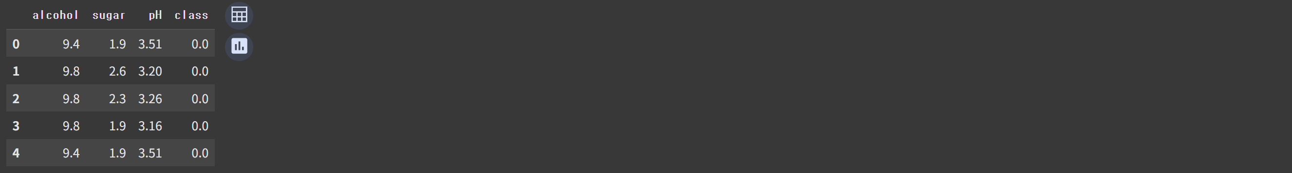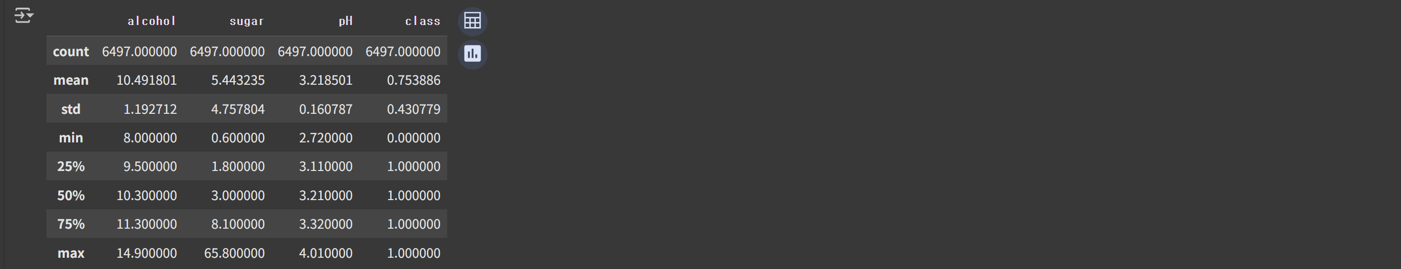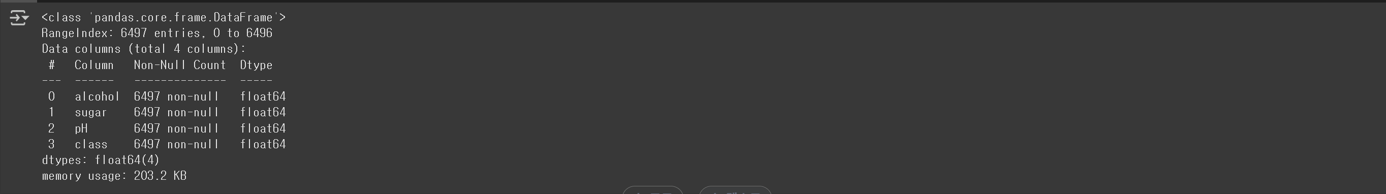 출력결과를 보면 6,497개의 샘플이 있고, 4개의 열은 모두 실수값이다